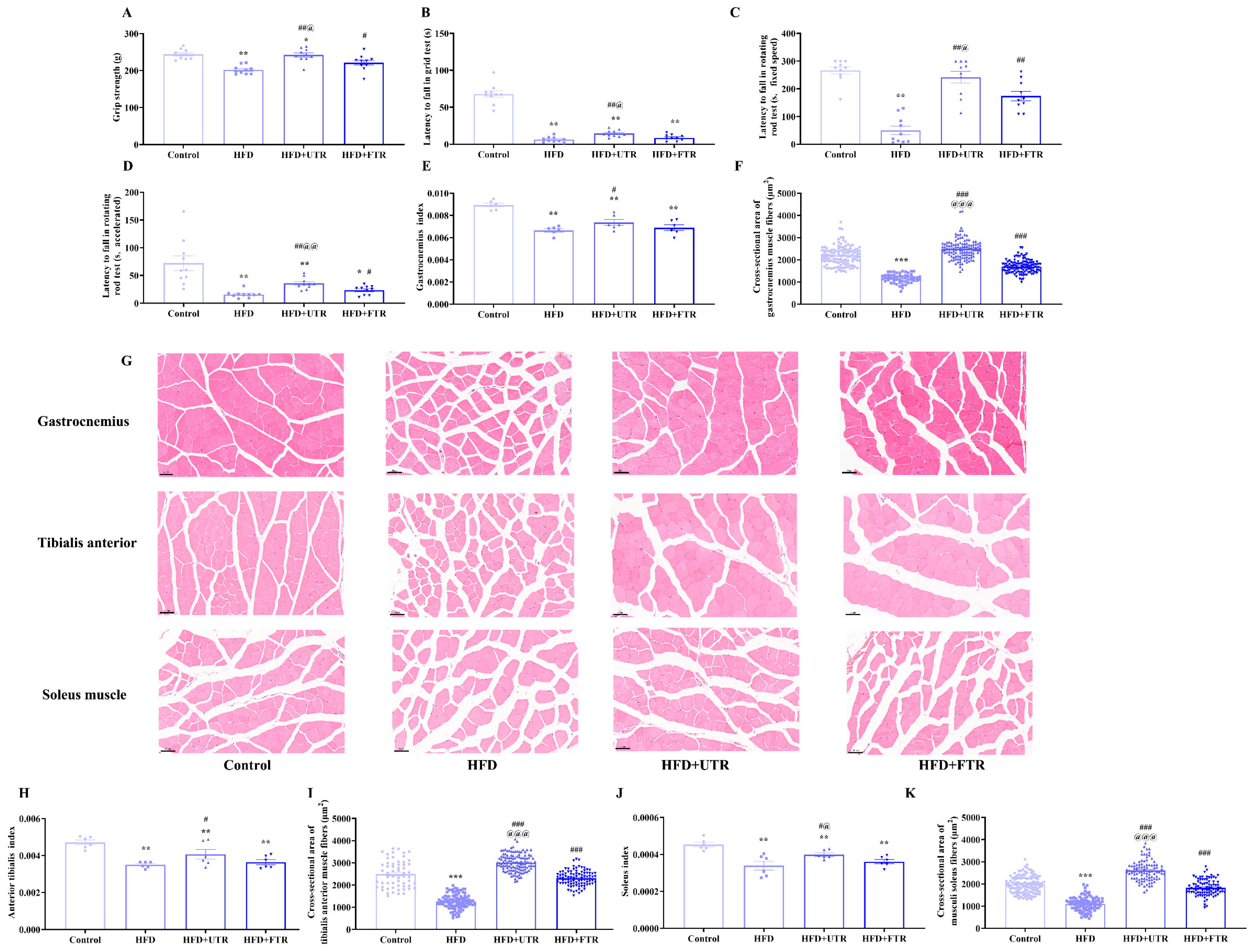 2.7. Exercise Improves the Reduction in Skeletal Muscle Mass and Functional Decline Induced by HFD