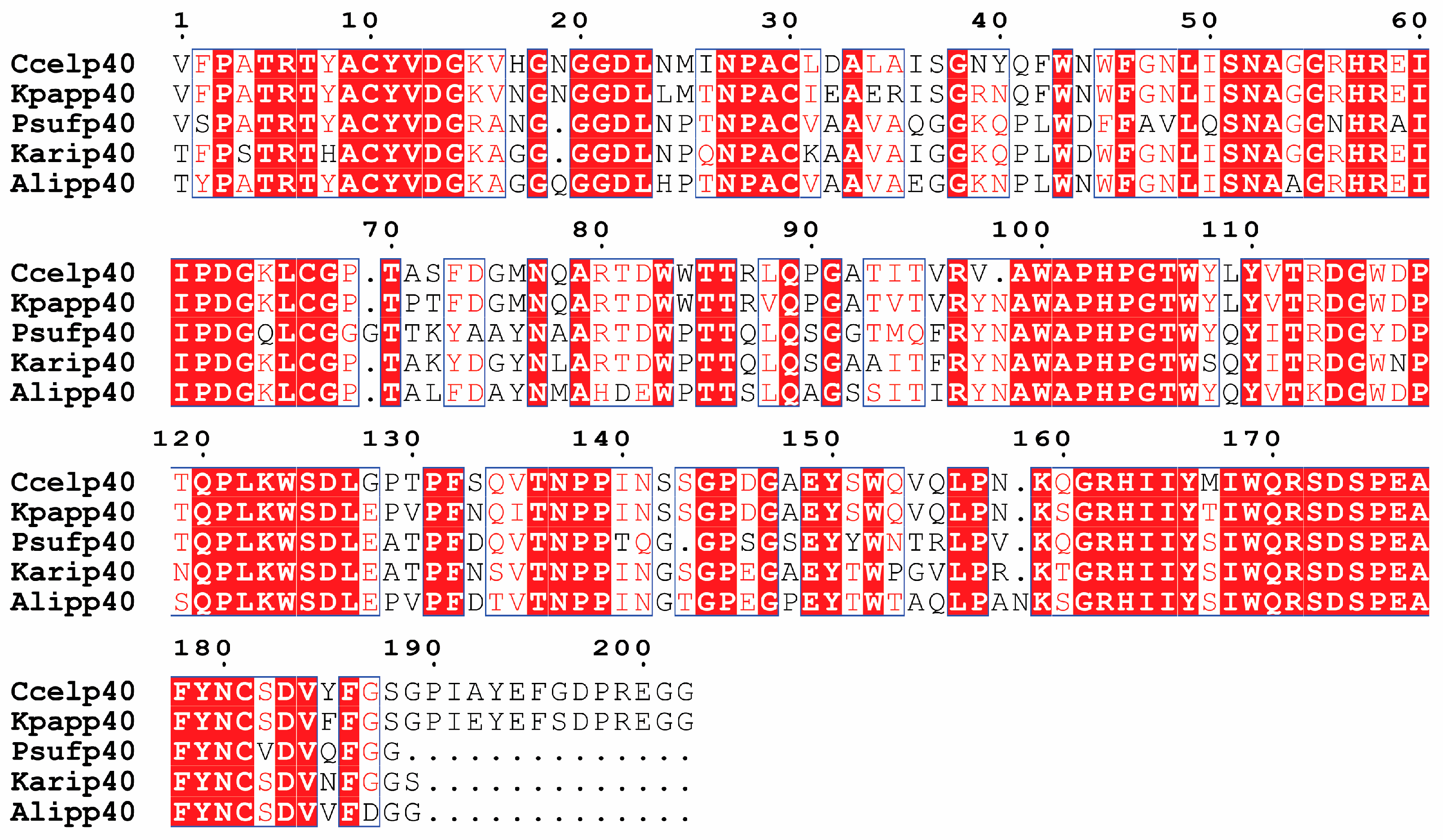 p40). Amino-acid sequences corresponding to the expressed catalytic domains (following removal of native signal peptides and construct-specific N-terminal residues) were aligned with the reference Ccel