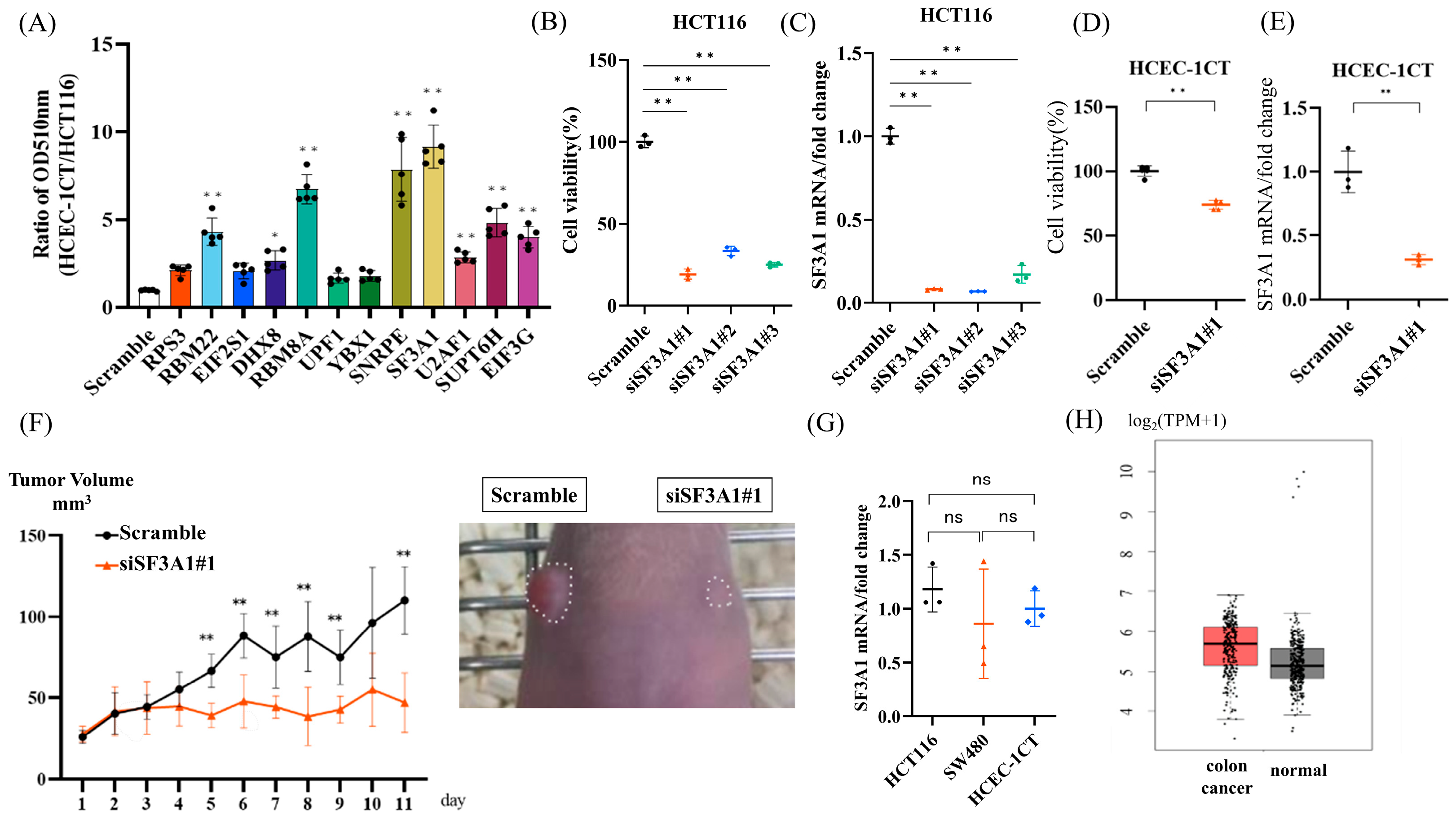 2.1. SF3A1 Enhances the Tumor Progression in CRC Cells, but Not in Non-Cancerous Cells