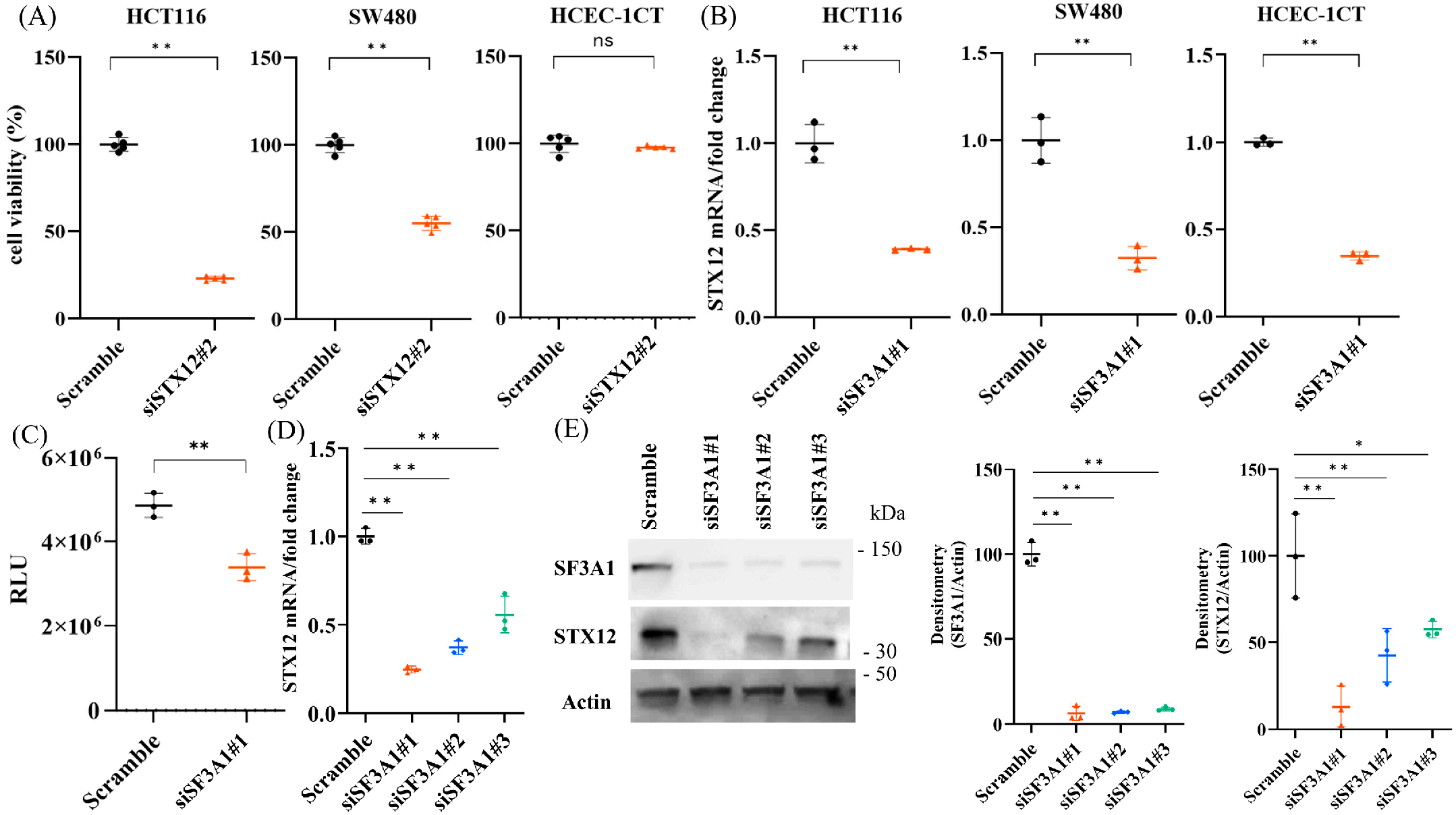 2.3. SF3A1 Inhibits Apoptosis of CRC Cells by Stabilizing the mRNA of Syntaxin12 (STX12)