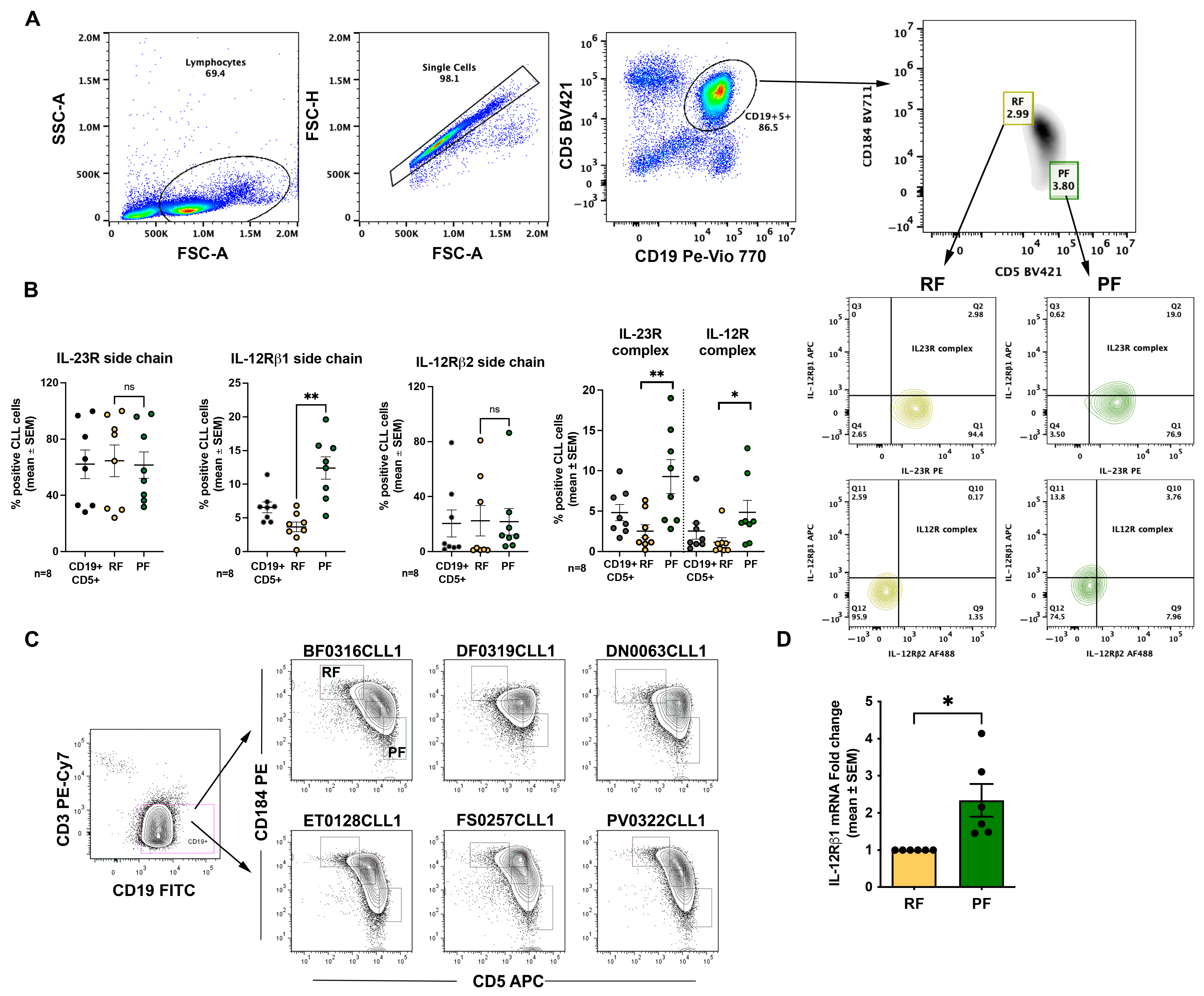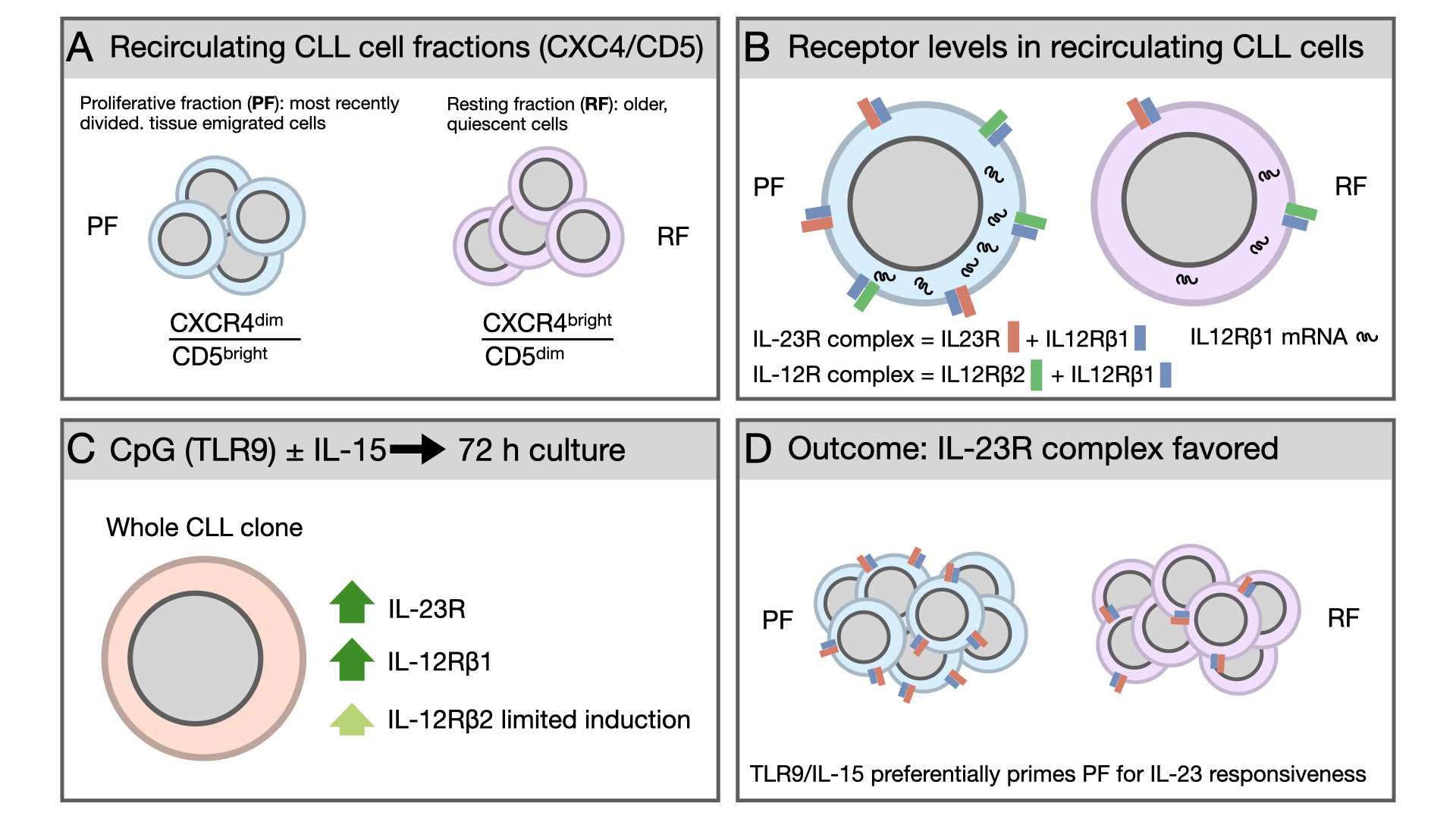 This study investigated the expression of IL-23R, IL-12Rβ1, and IL-12Rβ2 in recirculating CLL cells and in intraclonal subfractions defined by CD5 and CXCR4 co-expression (