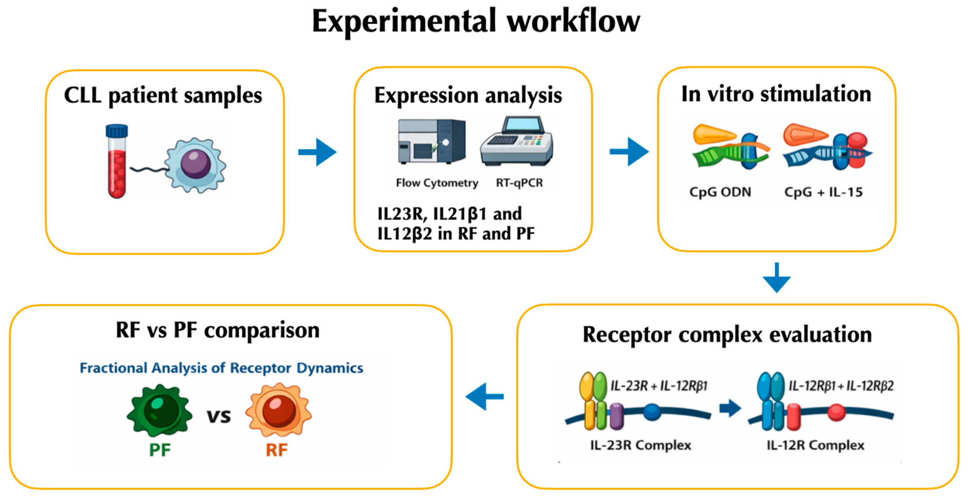 Given the limited understanding of how IL-12 family receptors are distributed within circulating CLL clones across distinct trafficking/proliferation states, this study aimed to (i) define, in ex vivo recirculating CLL cells, the expression of IL-23R, IL-12Rβ1, and IL-12Rβ2 across the main CXCR4/CD5-defined fractions, with particular focus on the resting fraction (RF) and proliferative fraction (PF); (ii) quantify fraction-specific co-expression patterns consistent with assembly of the IL-23 receptor complex (IL-23R + IL-12Rβ1) versus the IL-12 receptor complex (IL-12Rβ1 + IL-12Rβ2); and (iii) determine whether, and to what extent, these receptor subunits/complexes are inducible by antigen-independent activation, using TLR9 stimulation (CpG) with or without IL-15, both in bulk CLL cells and in a fraction-resolved manner, to test for an intraclonal bias toward the IL-23/IL-23R axis relative to IL-12/IL-12R.
