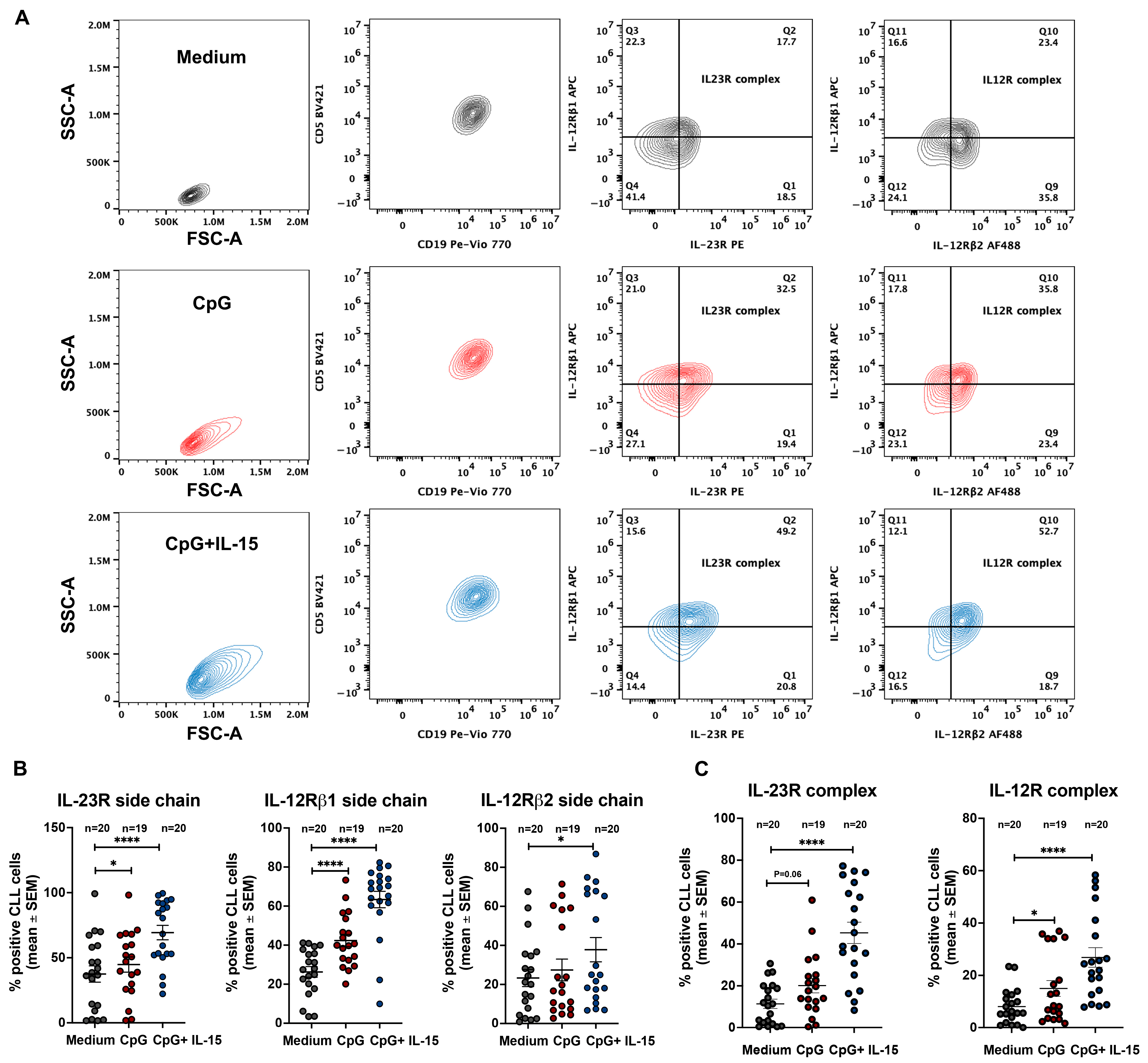 It is noteworthy that the most consistent induction of IL-23R and IL-12Rβ1 occurred in the presence of IL-15. In our setting, CpG alone was generally less effective at inducing significant changes in IL-23R/IL-12Rβ1 expression. This is in line with the concept that IL-15 can prevent CpG/TLR9-associated apoptosis and allow significant CLL clonal expansion [