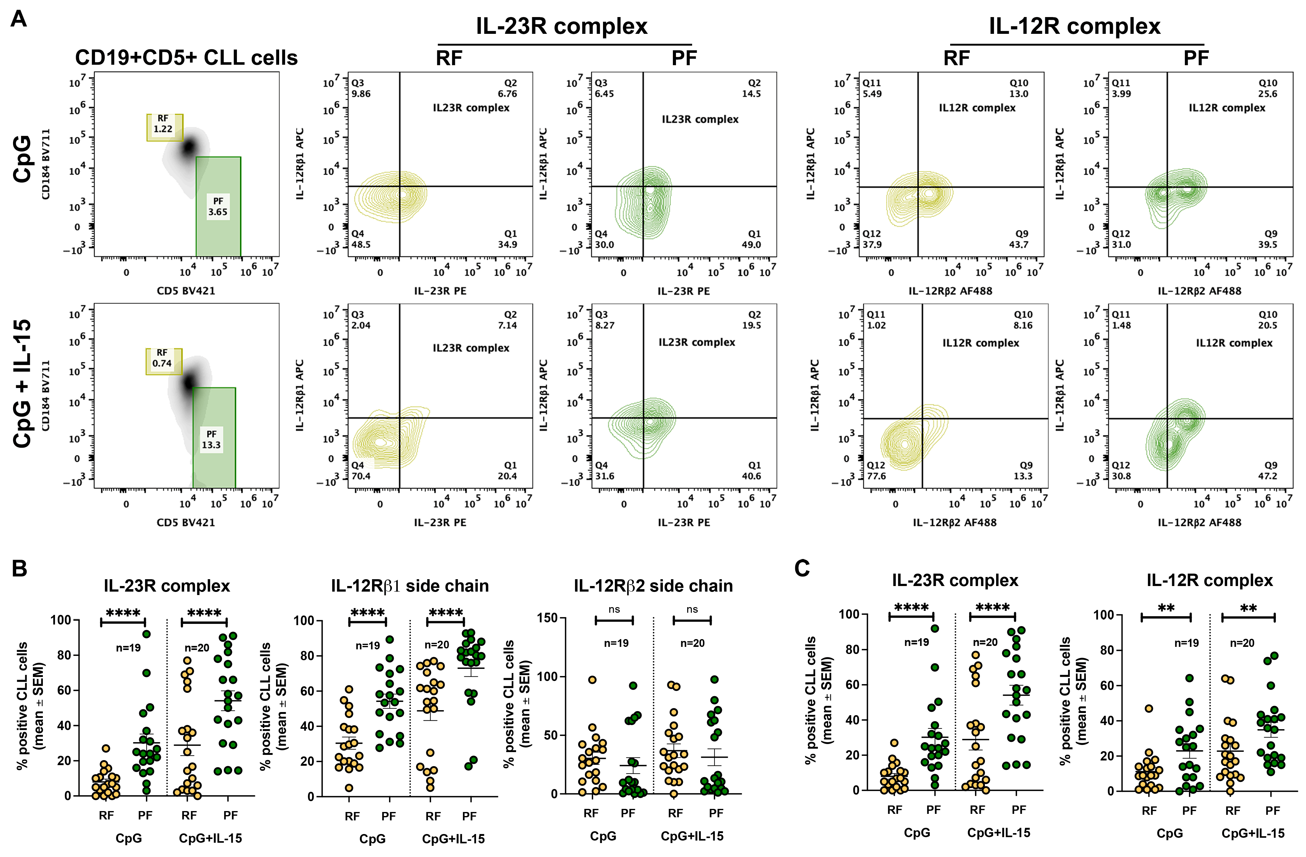 A further relevant observation is the persistently limited induction of IL-12Rβ2 in response to CpG/IL-15 stimulation. Although recirculating CLL clones showed variable baseline IL-12Rβ2 expression, PF generally displayed a lower proportion of IL-12R complex-positive cells than IL-23R complex-positive cells, particularly after CpG/IL-15 stimulation (