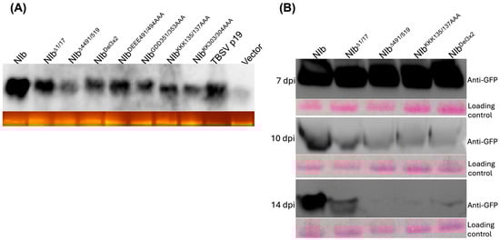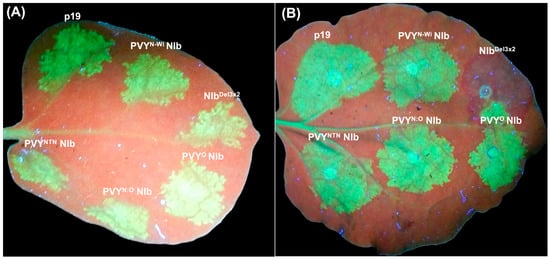 To identify amino acid residues involved in NIb suppression of RNA silencing, we introduced mutations in the NIb of PVYNTN, which is spreading increasingly in North America, while the incidence of PVYO, the ordinary strain, has been decreasing [69,70,71,72,73]. These mutations were introduced using the Q5 Site-Directed Mutagenesis Kit (New England Biolabs, Ipswich, MA, USA) with the primers listed in Table 1B. These mutations and NIb functional domains are illustrated in Figure 12. First, the N-terminal 17 amino acid residues that contain the recently reported NIb nuclear localization signal (NLS) [12] were deleted, obtaining the mutant designated NIbΔ1/17. A second truncation was produced by deleting the last 28 amino acids of PVYNTN NIb, obtaining NIbΔ491/519. To identify additional NLSs, we searched for lysine-rich motifs, which are typically found in NLSs and identified motifs 135KKK137 and 303KK304. These lysine residues were replaced with alanine, obtaining NIbKKK135/137AAA and NIbKK303/304AA, respectively. We investigated other conserved motifs, including the acidic motif 491DEEE494 and 351GDD353, which were substituted with alanine, obtaining NIbDEEE491/494AAA and NIbGDD351/353AAA, respectively. The 351GDD353 motif is a critical component of the catalytic site within the viral RdRP protein [74]. An NIb null mutant, NIbDel3×2 (negative control), was generated from PVYNTN NIb by deleting nucleotides GT at position bps 855–856 and truncating 50 bps from the 3′ end. These PVYNTN NIb mutants were cloned into pEarleygate100 and pEarleygate101 binary vectors, as described above, and the recombinant plasmids were introduced into the A. tumefaciens strain GV3101.