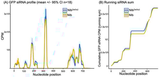 We profiled small RNAs mapped to GFP in 16c leaves co-infiltrated with PVYNTN NIb/35s::GFP, as well as with NIbDel3×2/35s::GFP at 14 dpi (n = 6 libraries; 3 biological replicates per treatment). Position-wise coverage in counts per million (CPM) on a linear scale showed three reproducible siRNA hotspots across the GFP sequence at ap ≈175 nt, ≈320–330 nt, and ≈560–700 nt (Figure 5A). Peak heights differed modestly between treatments: the 5′-proximal hotspots (≈175 and ≈320–330 nt) tended to be somewhat higher in samples expressing NIbDel3×2. Within the broader 3′ hotspot region (≈560–700 nt), the two treatments were broadly similar overall, with a prominent local maximum near ≈675 nt higher in NIbDel3×2. This pattern indicates a modest shift, where GFP siRNAs accumulate along the transcript rather than a uniform gain or loss at all sites. We therefore interpret the NIb versus NIbDel3×2 contrast as a positional redistribution of GFP-derived siRNAs, rather than a pronounced change in any single peak.