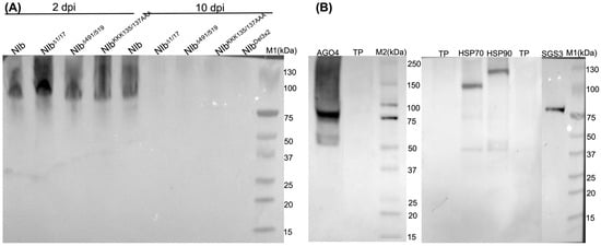 To identify host protein(s) in the RNA silencing pathway that likely interact with NIb, leading to suppression of RNA silencing, we used an in planta protein–protein interaction assay. The pEarleygate101 plasmid used to express NIb, as described above, contains YFP and HA-tag as the C-terminal fusion, and the nine host genes investigated for interaction with NIb contain a C-terminal 6×HIS tag, as described in Materials and Methods. This allowed us to detect interacting complexes using HIS-tag purification beads, followed by immunoblotting with HA-tag antibodies. NIb-HA fusion was therefore co-agroinfiltrated into N. benthamiana plants with each host protein. At 2 to 5 dpi, infiltrated leaves were collected, and protein complexes were purified using a Ni-NTA (nickel-nitrilotriacetic acid) magnetic bead kit (Thermo Fisher Scientific, Waltham, MA, USA) under native conditions. After native PAGE gel electrophoresis separation of protein complexes, the presence of NIb-HA fusions was tested using HA antibodies in a Western blot assay. Of the nine co-infiltrations, protein bands were observed in AGO4, HSP70, HSP90, and SGS3 samples, indicating interaction between these proteins and NIb (Figure 9). These proteins play key roles in RNA silencing. For example, AGO4 is a key effector of the RNA-directed DNA methylation antiviral pathway [44]; HSP70 and HSP90 are molecular chaperones required for loading siRNAs into RISC [45]; and SGS3 works with RDR6 to convert ssRNAs into dsRNA, which DCL proteins process into secondary siRNA [46]. Therefore, these results suggest that NIb likely suppresses RNA silencing by interacting with at least one of these proteins. Interestingly, NIb/HSP70, NIb/AGO4, and NSP/SGS3 complexes showed smaller molecular weight proteins, but no bands corresponding to the native proteins, possibly indicating that interaction between NIb and these RNA silencing proteins leads to degradation of the interacting complex.