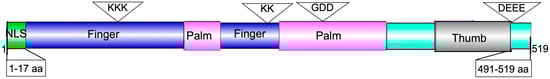 Representative diagram of the potyvirus NIb protein highlighting its functional domains. The conserved fingers, palm, and thumb subdomains of the RdRP are shown. Open inverted triangles mark amino acid residues that were substituted with alanine in this study, and open rectangles indicate truncations (deletions) introduced in NIb.
