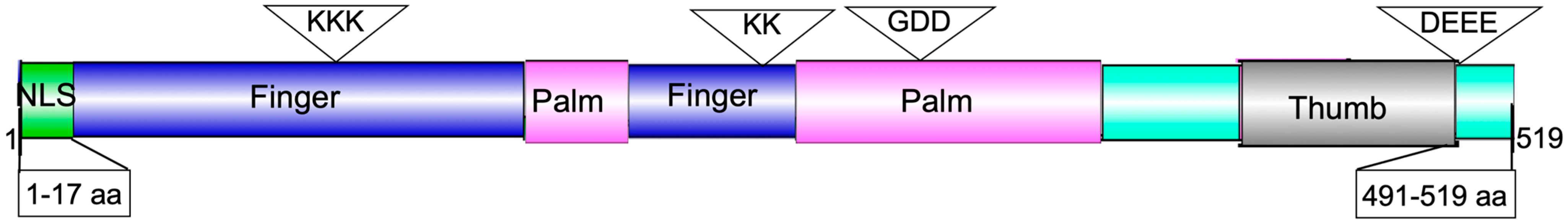 - Vázquez, A.L.; Alonso, J.M.M.; Parra, F. Mutation Analysis of the GDD Sequence Motif of a Calicivirus RNA-Dependent RNA Polymerase. J. Virol. 2000, 74, 3888–3891. [Google Scholar] [CrossRef] [PubMed]