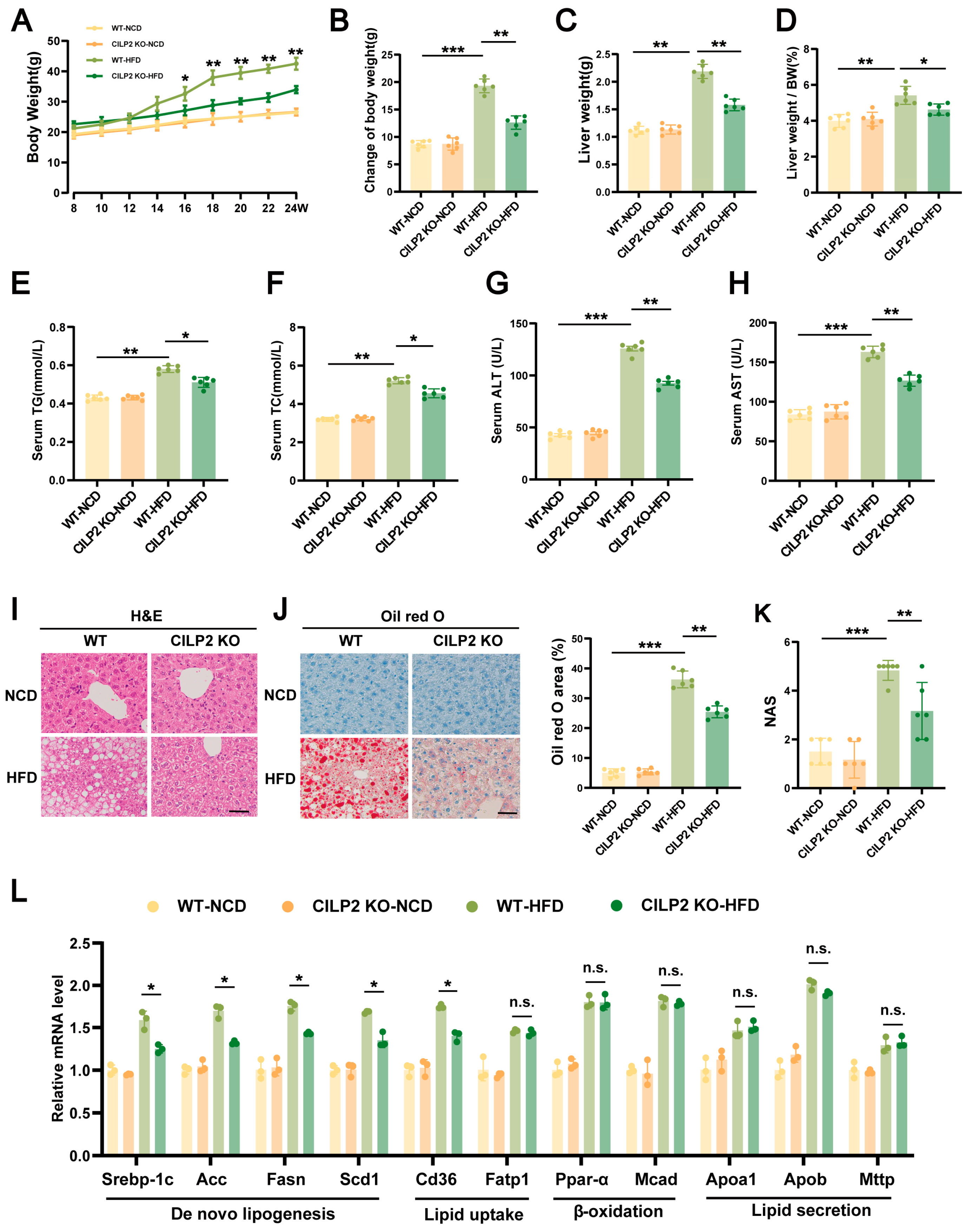 2.3. CILP2 KO Reduced Body Weight and Improved IR and Hepatic Steatosis in HFD-Fed Mice