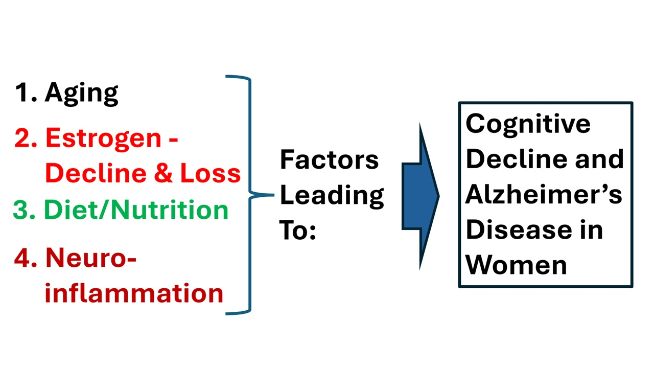 | CHANGES IN ESTROGEN: | One important factor is the decline in estrogen during perimenopause, starting around ages 35–45, and menopause, which occurs between 46 and 55 years of age (with the average age at menopause around 51–52 years of age). Estrogen supports brain glucose metabolism, synaptic plasticity, mitochondrial function, and regulation of neuroinflammation, along with many other protective brain effects. Estrogen loss can increase vulnerability to neuroinflammation, a process that becomes more pronounced with age and is linked to cognitive decline and neurodegenerative risk. |