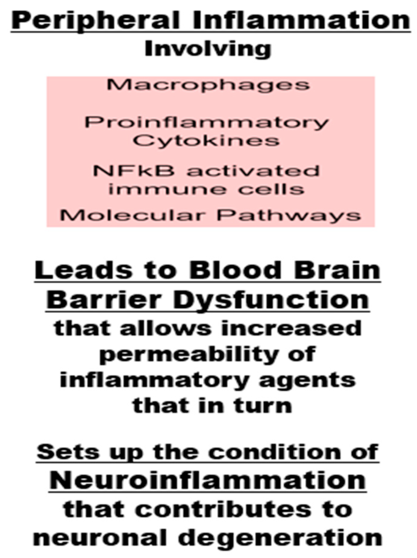 | DIET/NUTRITION: | Diet further modulates these processes, either exacerbating or mitigating inflammation. Nutrient-poor, highly processed diets can promote systemic and central inflammation, while diets rich in antioxidants, healthy fats, and anti-inflammatory compounds help counteract inflammatory pathways and support neural resilience. |