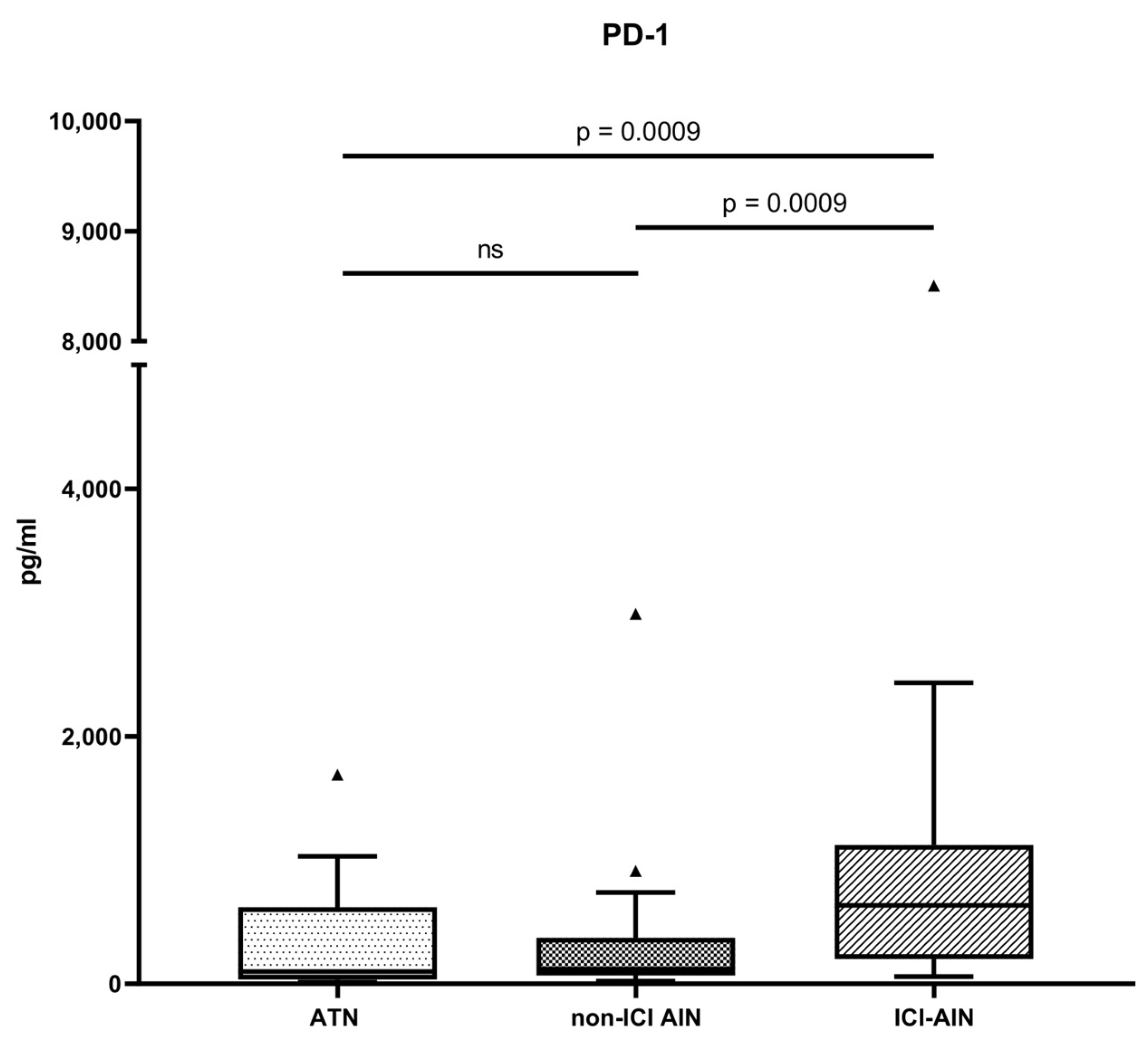 - Gomez-Preciado, F.; Martinez-Valenzuela, L.; Anton-Pampols, P.; Fulladosa, X.; Tena, M.G.; Gomà, M.; Jove, M.; Nadal, E.; Merino-Ribas, A.; Martin-Alemany, N.; et al. Urinary Soluble PD-1 as a Biomarker of Checkpoint Inhibitor-Induced Acute Tubulointerstitial Nephritis. Clin. Kidney J. 2024, 17, sfae200. [Google Scholar] [CrossRef]