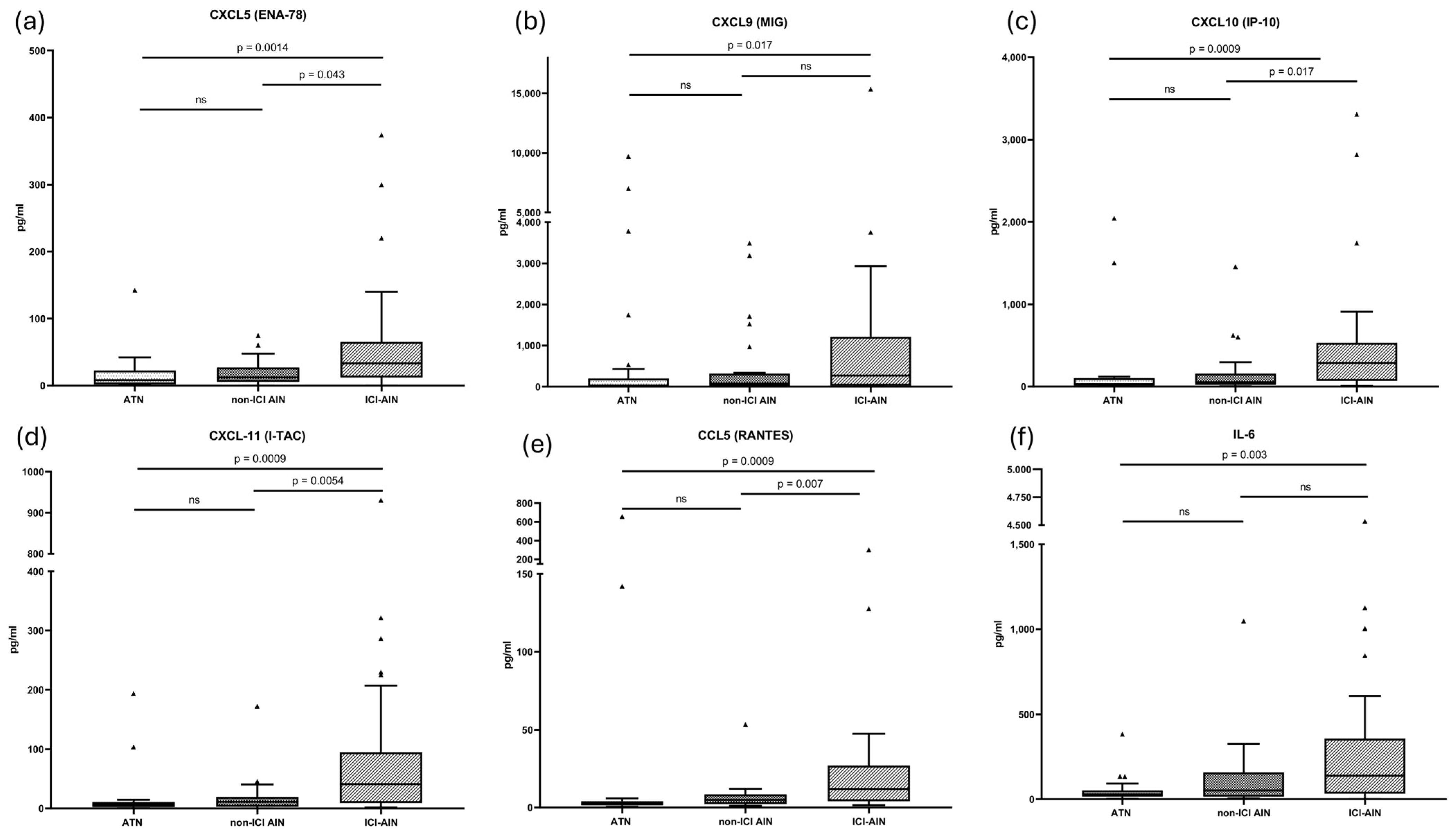 | Molecule | ICI-AIN (pg/mL) | ATN (pg/mL) | Non-ICI AIN (pg/mL) | p-Value ICI-AIN vs. ATN | p-Value ICI-AIN vs. Non-ICI AIN | p-Value ATN vs. Non-ICI AIN |