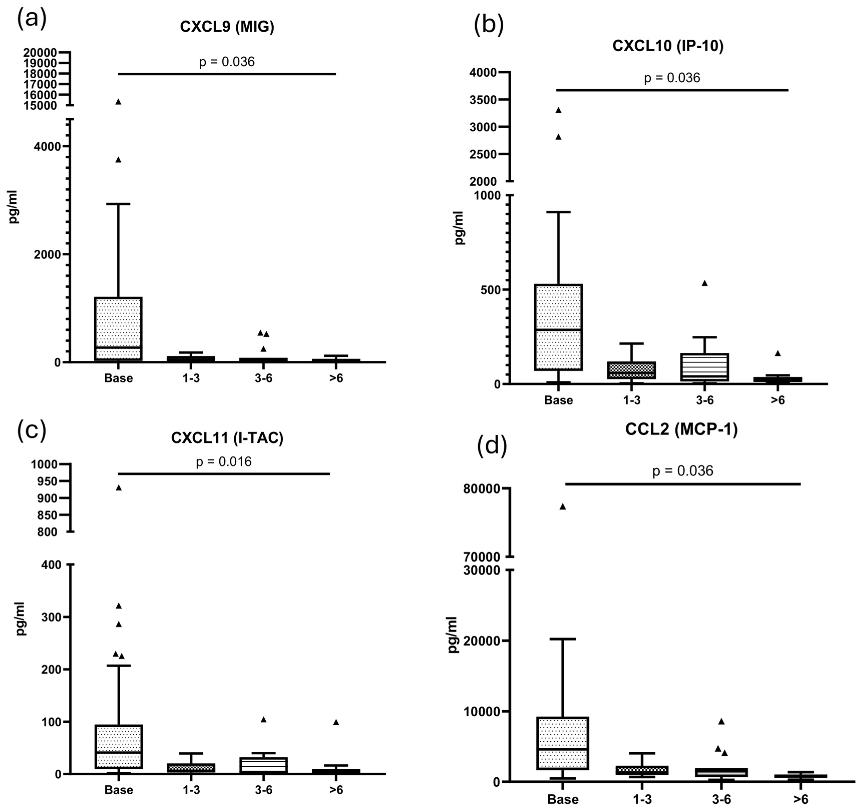 | CXCL9 (log) | 0.033 * | 2.01 (1.15–3.5) |