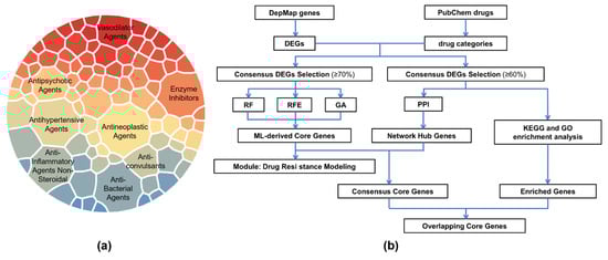 Drug classification and study workflow. (a) Distribution of drug categories, showing the eight categories with the largest numbers of compounds. The area of each sector is proportional to the number of drugs. (b) Overview of the study workflow, starting with drug categorization and differential gene expression identification, followed by core gene selection, resistance modeling, and functional enrichment analyses.