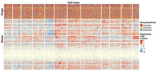 Gene expression and drug sensitivity data were obtained from the DepMap database (https://depmap.org/portal/, accessed on 18 January 2026). Drug sensitivity, measured as log2 fold change (log2FC), where log2FC < 0 indicated that the cell line was sensitive to the compound, and log2FC ≥ 0 indicated resistance. Cell line identifiers were harmonized across datasets using a conversion table to enable integration of drug sensitivity profiles with gene expression data.