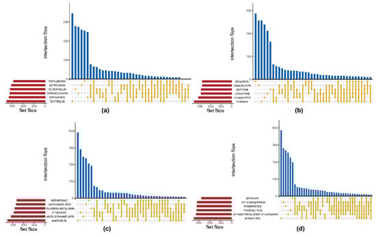 For each of the 82 drug categories, the intersection of DEGs across all compounds within the category was computed, applying an appropriate threshold to define the inclusion criteria for intersecting DEGs. UpSet plots depicting the number of intersecting genes across different drug categories and individual drugs were generated using the UpSetR package (version 1.4.0) in R.