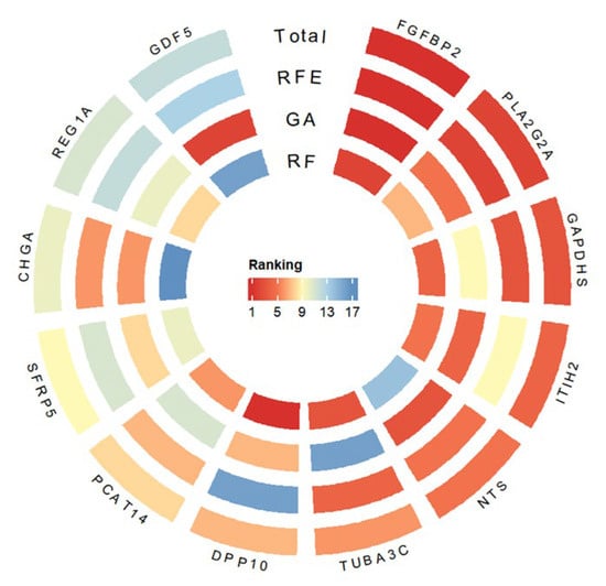 To obtain a stable and objective gene importance ranking, the rankings produced by the three feature selection methods were integrated using a rank-based averaging strategy, in which each method contributed equally to the final comprehensive ranking. This integration approach reduces method-specific bias and enhances the robustness of the selected gene set. A circular heatmap of the top-ranked genes was generated using the R packages circlize (version 0.4.10) and ComplexHeatmap (version 2.22.0).