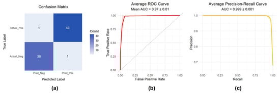 Model performance evaluation. (a) Confusion matrix of classification results; (b) Receiver Operating Characteristic (ROC) curve; (c) Precision–Recall (PR) curve.