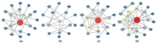 Figure 7 displays the PPI networks of antibacterial agents, antineoplastic agents, non-steroidal agents, and enzyme inhibitors, where node size and color reflect the degree values. Core genes were identified based on betweenness centrality (Table 1), and the complete node-level metrics for all PPI networks are provided in Supplementary Table S3. Notably, several genes were consistently detected by both network analysis and the machine learning feature importance method, including NTS and PLA2G2A (antibacterial agents), A2M and NTS (antineoplastic agents), ELN, ITIH2, ADCYAP1, NTS, and GAPDHS (non-steroidal agents), and ADCYAP1, NTS, CHGA, and PLA2G2A (enzyme inhibitors).