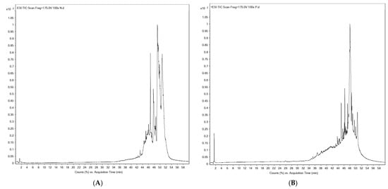 In analysis, 500 mg of the POW9TM sample was reconstituted in 1% (v/v) DMSO (1.0 mL), ultrasonicated on an ice bath for 10 min, and then centrifuged at 17,000× g at room temperature for 10 min. Afterward, the supernatant was passed through a syringe filter (cellulose ester type, 13 mm diameter, 0.45 µm pore size, Merck Amicon filter, Sigma-Aldrich Chemical Company, Limited, Saint Louis, MO, USA). In the analysis, the filtrate (5 μL) was injected into the HPLC system using an autosampler and fractionated on a column (InfinityLab Poroshell 120 EC octadecyl silane type, 2.1 mm × 100 mm, 2.7 µm particle size, Agilent Technologies Company, Santa Clara, CA, USA) that had been thermally regulated at 40 °C and eluted in a linear gradient mode using mobile phase A (0.1% formic acid in DI) and mobile phase B (0.1% formic acid in acetonitrile) at a flow rate of 0.35 mL/min for 60 min. The timing program employed for gradient elution was as follows: 0 ⟶ 15 min; %A/B (100/0 ⟶ 90/10), 15 ⟶ 30 min; %A/B (90/10 ⟶ 40/60); 30 ⟶ 45 min: A (40/60 ⟶ 10/90); and 45 ⟶ 60 min; A (10/90 ⟶ 0/100). Peak identification was performed in positive mode using the library database, and the identification scores were sorted for characterization and m/z verification purposes.