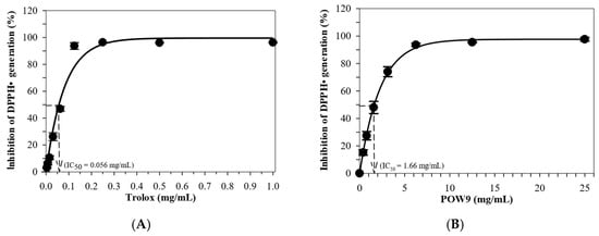 Inhibition of DPPH radical (DPPH•) generation by Trolox (A) and POW9TM (B). Data are expressed in mean ± standard error of the mean (SEM) of three independent experiments.