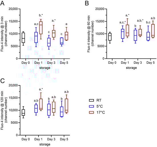 Intracellular Ca2+ levels for samples at RT (day 0) and subsequently stored at 17 °C (red) or 5 °C (blue) for up to 5 days (n = 6 boars). Baseline values of the average fluorescence intensity for Fluo-4, i.e., the free intracellular Ca2+ level, in viable acrosome-intact sperm after 3 min (A), 60 min (B), and 120 min (C) incubation at 38 °C have been plotted. Storage temperature (17 °C vs. 5 °C) and storage time (day 1 vs. day 3 vs. day 5) had a significant impact on the intracellular Ca2+ levels (p < 0.05). Different small letters (a–c) indicate significant differences (p < 0.05). An asterisk indicates significant differences between a given storage time by temperature combination and the reference point, i.e., the sample on the day of dilution (day 0; p < 0.05).