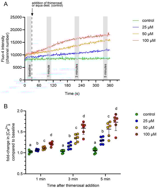 Representative dose–response curves are shown in Figure 2A. A concentration of 100 µM thimerosal was selected for subsequent experiments because it produced the most pronounced changes at all evaluated time points (1, 3, and 5 min) after addition (Figure 2B). In summary, a thimerosal concentration of 100 µM was identified for studies of Ca2+ release from intracellular stores.