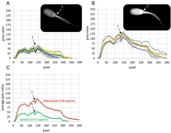 Localization and quantification of free intracellular calcium levels in viable boar spermatozoa on the day of semen collection, before and after exposure to thimerosal. Fluo-4 signal intensities in viable, i.e., propidium iodide-negative spermatozoa, were quantified in the longitudinal axis of the sperm head and anterior midpiece (yellow line in gray-scale images inserted in (A,B)) in ImageJ. Intensity values were plotted for control (aqua dest.; (A); n = 11 spermatozoa) and exposure to 100 µM thimerosal for 5 min ((B); n = 8 spermatozoa). Each colored line represents the intensity profile for an individual spermatozoon. Intensity profiles were aligned based on a characteristic local minimum in fluorescence intensity at the junction between the sperm head and tail, indicated by position ‘1’ in the images and plots. Average gray values for both groups are shown in (C).