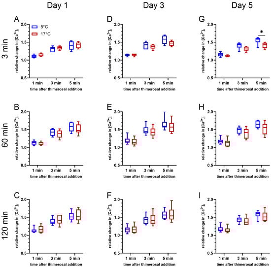 An effect of storage temperature on Ca2+ release from intracellular stores induced by 100 µM thimerosal was absent on day 1 (d1) of storage (p > 0.05; Figure 4A–C). At all timepoints, the gating strategy considered exclusively viable spermatozoa with intact acrosomes. A significant effect of storage temperature was noted on day 5 (d5) of storage after 5 min of incubation at 38 °C (F(1, 5) = 6.691, p < 0.05; Figure 4G). The relative change in [Ca2+]i for sperm stored at 5 °C tended to be higher 1 min (p = 0.060) and 3 min (p = 0.080) after the thimerosal addition, and was significantly higher 5 min after the thimerosal addition. A similar trend was observed after 60 min of incubation at 38 °C on day 3 (F(1, 5) = 5.955, p = 0.059; Figure 4E) and day 5 (F(1, 5) = 4.497, p = 0.087; Figure 4H). At both time points, samples stored at 5 °C tended to show a greater amplitude in the initial increase in intracellular Ca2+ levels, i.e., 1 min after thimerosal addition (Figure 4E: p = 0.079; Figure 4H: p = 0.095). In addition, the maximum increase in intracellular Ca2+ levels at 3 min (Figure 4E: p = 0.066; Figure 4H: p = 0.103) and 5 min (Figure 4E: p = 0.064; Figure 4H: p = 0.081) after the addition of thimerosal tended to be higher. After 120 min of incubation, changes in free intracellular Ca2+ levels showed non-significant differences between the samples stored at 17 °C and at 5 °C, regardless of the semen storage time (Figure 4C,F,I).