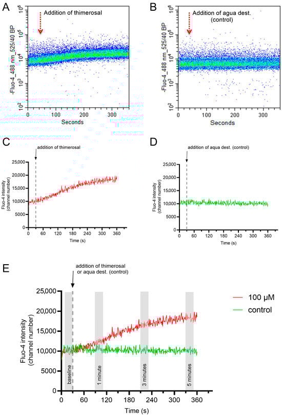 Representative flow cytometry plot for the changes in the free intracellular Ca2+ concentration in viable acrosome-intact sperm upon addition of 100 µM thimerosal or the solvent (aqua dest; control). Data were gated to restrict the analysis to single, viable, and acrosome-intact sperm (Hoechst 33342-positive, PI-negative, and PNA-Alexa FluorTM 647-negative). The flow cytometry plots show the change in fluorescence intensity for Fluo-4 based on the single sperm data during the assessment (A,B). The corresponding graph depicts the average change in fluorescence intensity for each second of the assessment (C,D). For systematic comparisons of the response curves, fluorescence intensities over 20 s (Seconds 10 to 30) were averaged to represent the baseline Ca2+ values, as well as the Ca2+ levels at 1 min (Seconds 80 to 100), 3 min (Seconds 200 to 220), and 5 min (Seconds 320 to 340) after the addition of thimerosal/aqua dest were determined (E).