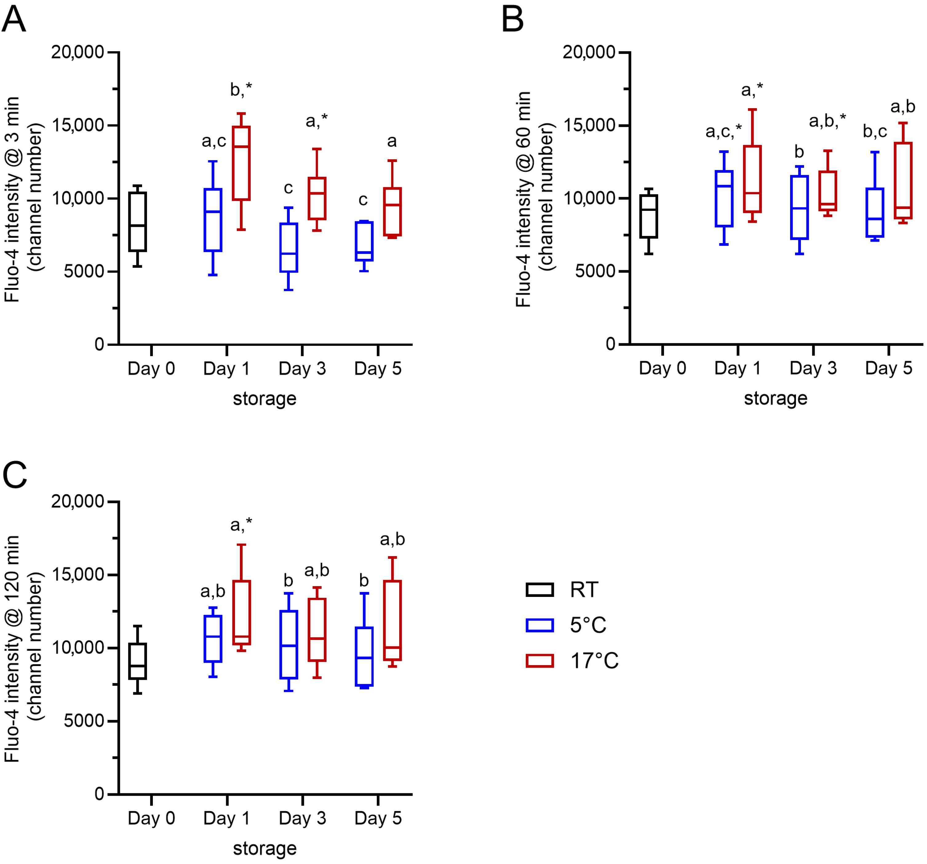 2.2. Effect of Storage Temperature and Time on Baseline Free Intracellular Ca2+ Levels During Incubation at 38 °C