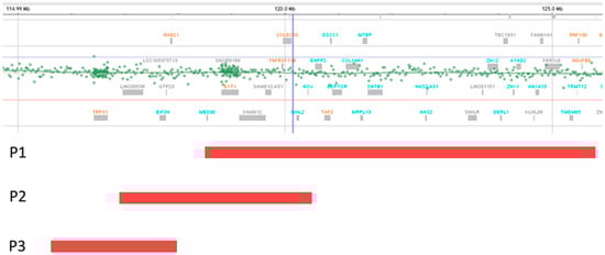 Deletion representations (red bands) for patients 1, 2, and 3. The deletion of P2 partially overlaps with P1 and P3 deletions. Deletions of P1 and P3 do not overlap.