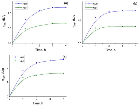 Dependences of ηinh for ODPA-AFL (a), ODPA-AFL0.5:DABA0.5 (b), and BTDA-AFL0.5:DABA0.5 (c) on the reaction time in NBP and NMP (T = 180 °C, Ar).