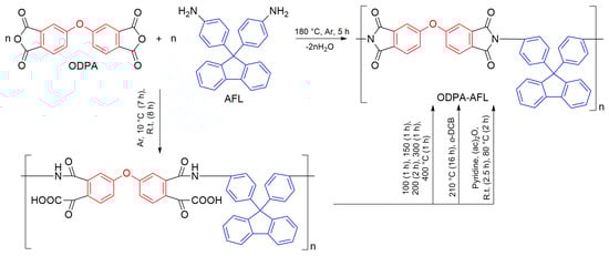 The most common methods of obtaining PIs are two- and, to a much lesser extent, one-step polycondensation of diamines and tetracarboxylic acid dianhydrides. Both of these approaches were compared using the example of a highly soluble cardo PI (ODPA-AFL) formed from 4,4′-oxydiphthalic anhydride (ODPA) and 9,9-bis(4-aminophenyl)fluorene (AFL).