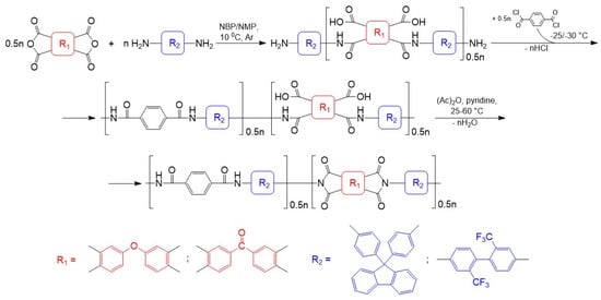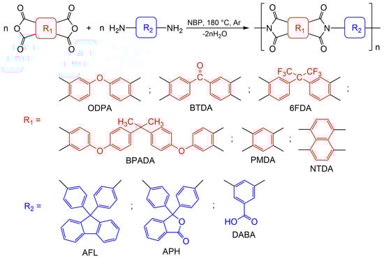- Bayminov, B.A.; Zabegaeva, O.N.; Sapozhnikov, D.A.; Vygodskii, Y.S. Trends in the Synthesis of Polyimides and Their Nanocomposites. Ineos Open 2021, 4, 78–89. [Google Scholar] [CrossRef]