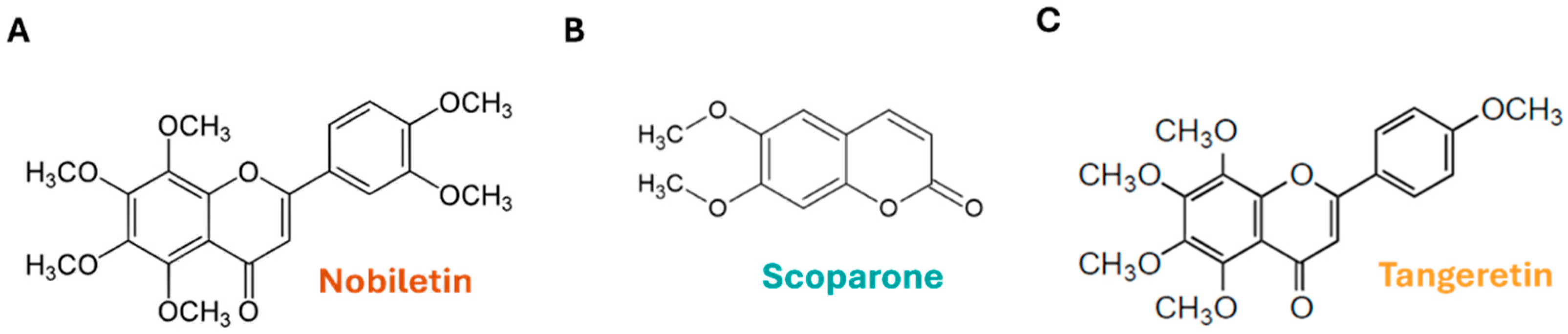 - Lee, Y.Y.; Lee, E.J.; Park, J.S.; Jang, S.E.; Kim, D.H.; Kim, H.S. Anti-Inflammatory and Antioxidant Mechanism of Tangeretin in Activated Microglia. J. Neuroimmune Pharmacol. 2016, 11, 294–305. [Google Scholar] [CrossRef] [PubMed]