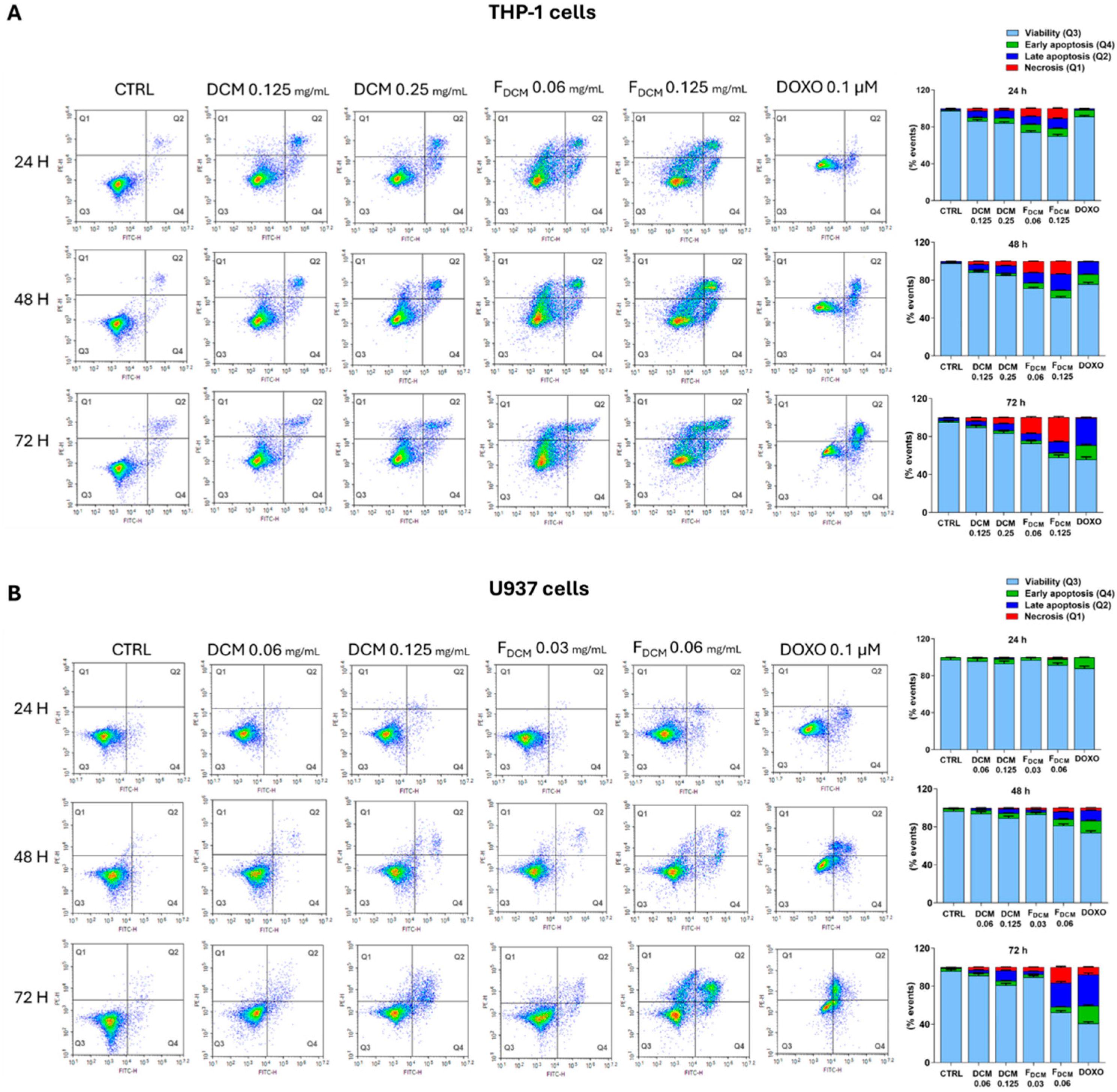 2.5.1. Dichloromethane Extract and Fractions Induced Apoptosis and Necrosis in Acute Myeloid Leukemia Cells