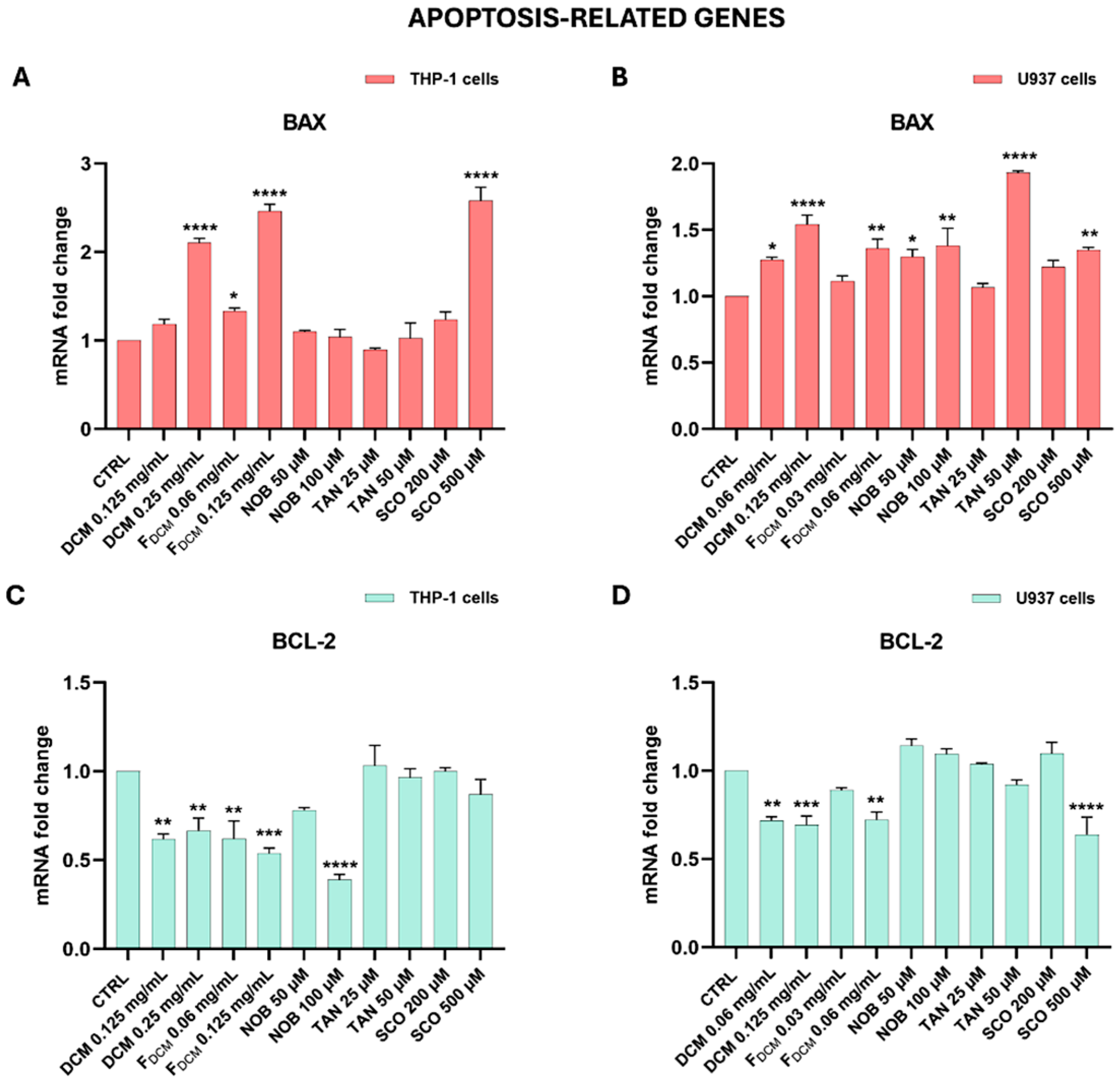 2.5.3. Dichloromethane Extract, Fractions, and Single Compounds Modulated the Expression of Apoptotic-Related Genes in Acute Myeloid Leukemia Cells