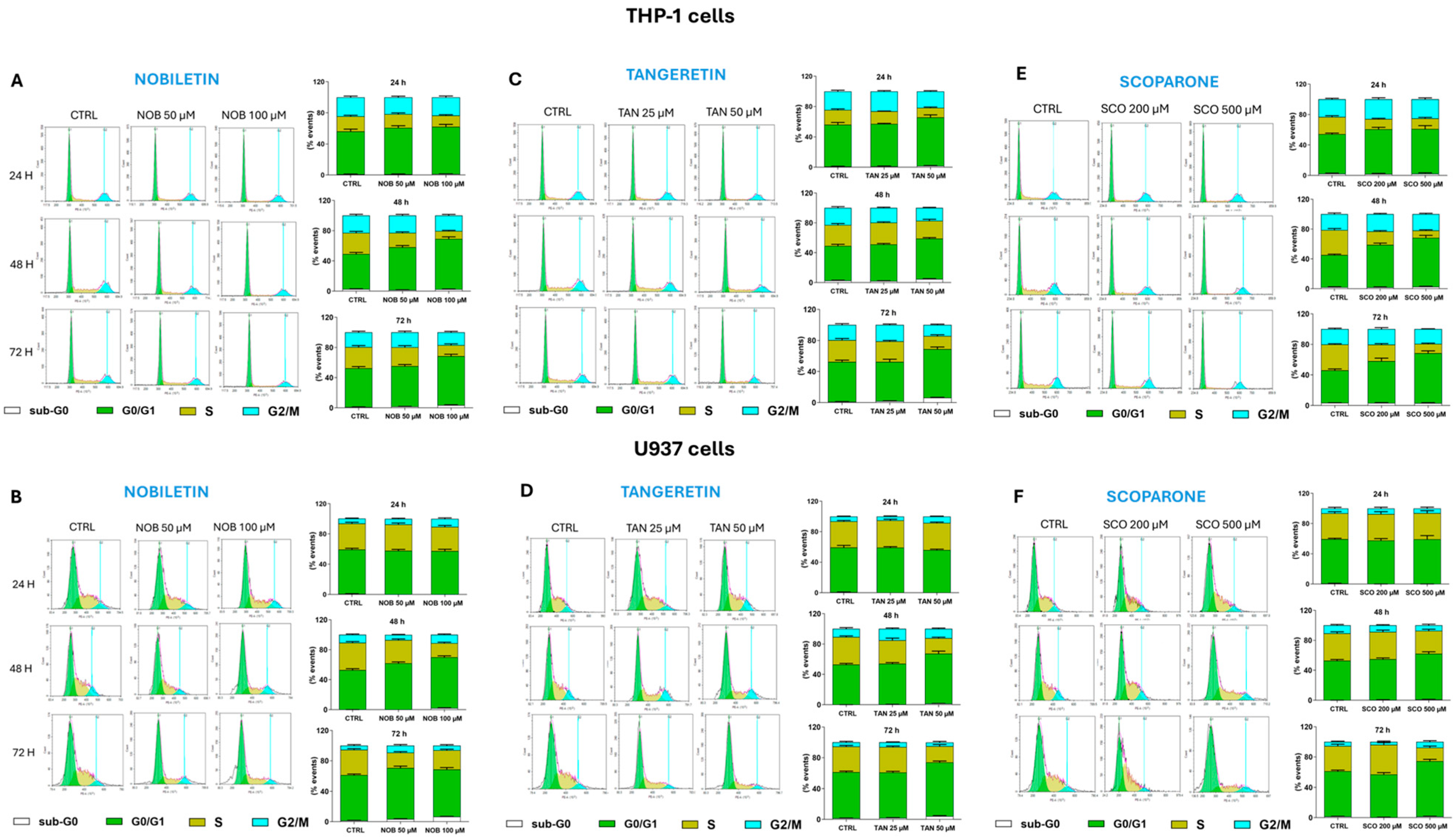 2.6.2. Cell Cycle Arrest in G1 Phase Induced by Nobiletin, Tangeretin, and Scoparone in Acute Myeloid Leukemia Cells