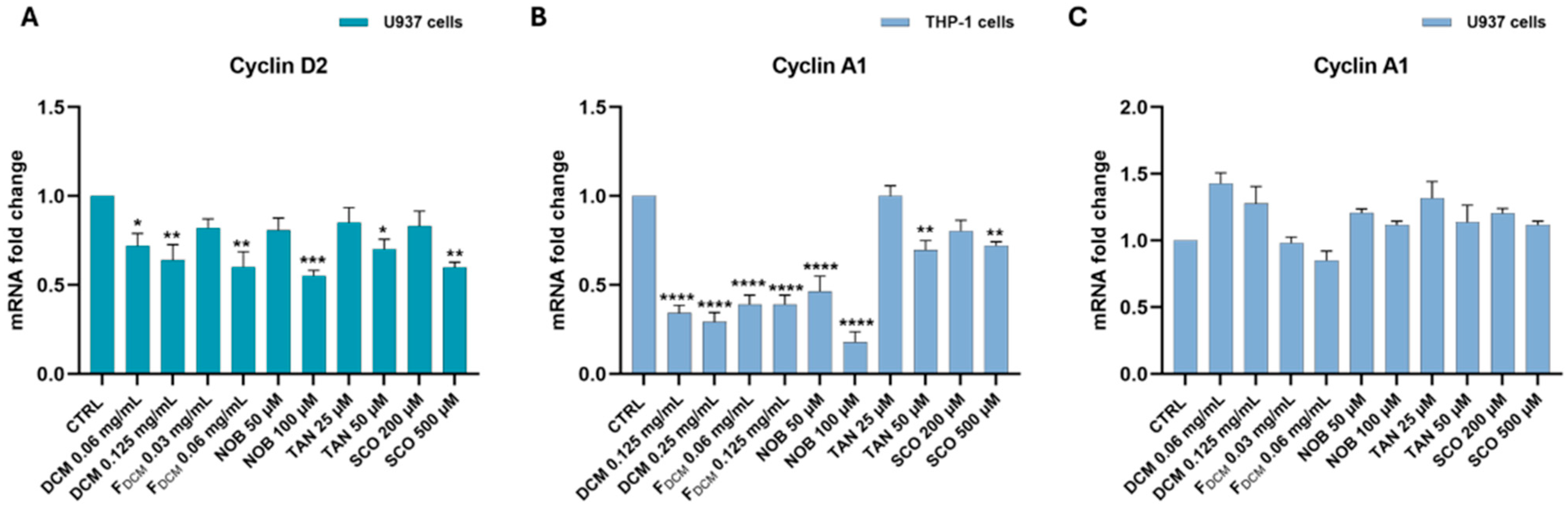 2.6.3. Dichloromethane Extract, Fractions, and Single Compounds Reduced the Gene Expression of Cell Cycle Regulators in Acute Myeloid Leukemia Cells