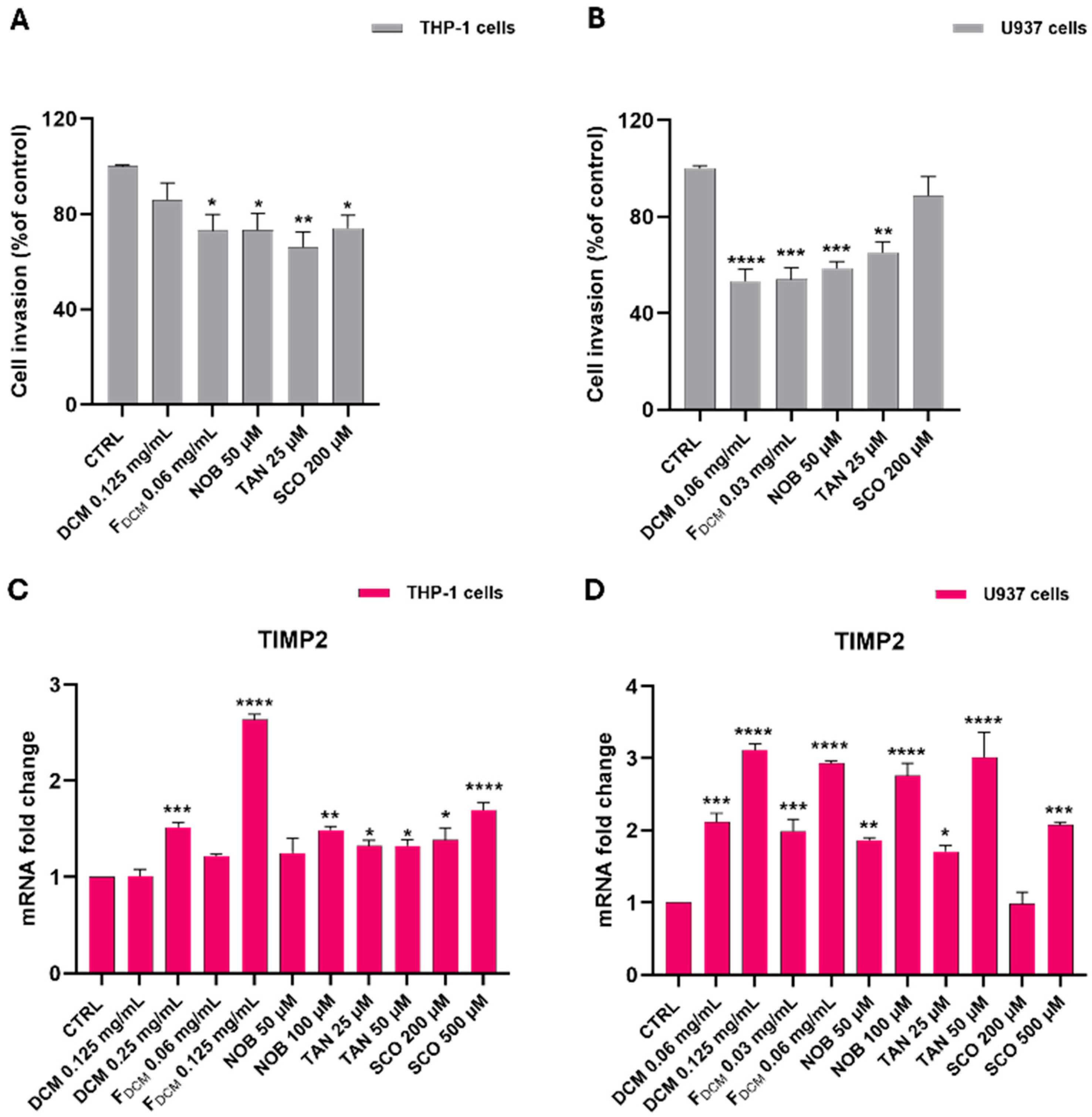 2.6.4. Dichloromethane Extract, Fractions, and Single Compounds Reduced the Invasiveness of Acute Myeloid Leukemia Cells by Increasing TIMP-2 Expression
