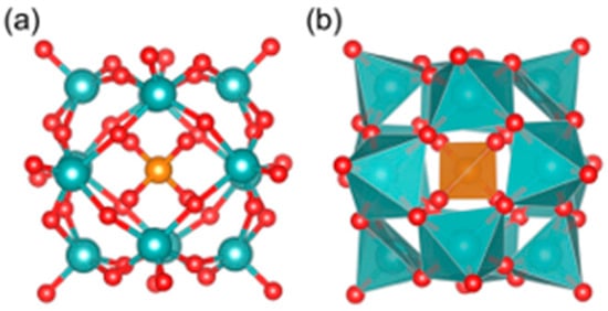 The ball-stick model (a) and polyhedral model (b) of [PO40Mo12]3−. Red color is used for oxygen atoms, dark orange for phosphorus, and cyan blue for molybdenum [48].
