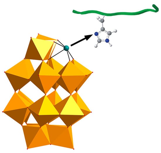 Building upon the earlier structure–activity relationship findings that highlighted molecular size and surface charge as key determinants for the anti-Aβ activity of pure inorganic POMs, Qu and co-workers further advanced this framework in 2014 by introducing transition-metal substitution into Wells-Dawson-type POMs and systematically evaluating their inhibitory effects on Aβ aggregation (Figure 2a) [15]. Metal substitution increases the surface negative charge density of POMs, significantly strengthening electrostatic interactions with the HHQK cationic cluster of Aβ. In addition, Ni2+ and Co2+ can coordinate with the imidazole nitrogen atoms of adjacent histidine residues (Figure 3), providing additional binding specificity and reinforcing the overall interaction with Aβ. More importantly, this class of POMs can block the coordination between Aβ and heme (with His13/His14 serving as key binding sites for the Aβ-heme complex), thereby significantly inhibiting the peroxidase activity of the Aβ-heme complex and reducing reactive oxygen species (ROS) production. In vivo studies further showed that POMds-Dawson-Ni is capable of crossing the blood–brain barrier, is metabolized within 48 h, and exhibits no detectable toxicity, suggesting its potential as a bifunctional agent that inhibits Aβ aggregation and mitigates oxidative stress.