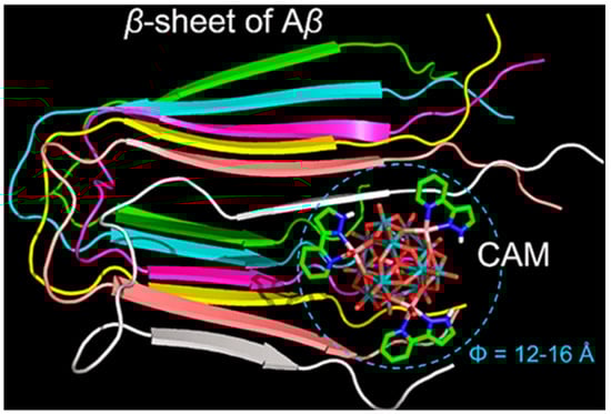 Overview of the CAM–Aβ complex represented in a space filling mode. The β-sheet strands of Aβ are colored differently to distinguish individual peptides. In the CAM, oxygen atoms are colored red, nitrogen atoms blue, carbon atoms green, cobalt atoms pink, and molybdenum atoms cyan [50].