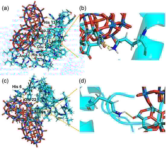 (a,b) The D-POM–Aβ complex (D-POM, D-enantiomeric polyoxometalate). Two hydrogen bonds were formed occurring at Lys 16, which are shown in partially enlarged views. (c,d) The L-POM–Aβ complex (L-POM, L-enantiomeric polyoxometalate). There is only one hydrogen bond between Lys 16 and L-POM [36].