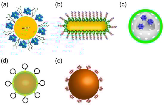 Structures of POM-based nanocomposites. (a) AuNPs@POM@PEG (AuNPs, gold nanoparticles; POMs, polyoxometalates; PEG, polyethylene glycol) (b) peptide conjugated Au nanorods (AuP) (c) rPOMs@MSNs@copolymers (rPOMDs, reduced polyoxometalates with Wells–Dawson structure; MSNs: mesoporous silica nanoparticles, copolymer: poly(N-isopropylacrylamide-co-acrylamide)) (d) AuNPs@POMD-8pep(AuNPs, gold nanoparticles; POMD, Wells–Dawson polyoxometalate, 8pep: N-Ac-Cys-hepta-peptide) (e) cerium dioxide/polyoxometalate (CeONP@POMs).