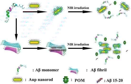 In 2017, Li et al. developed a nanoprobe based on peptide conjugated Au nanorods (AuP) [57]. AuP was obtained by co-assembling POM and the Aβ15–20 peptide onto the surface of gold nanorods with strong NIR absorption features via a self-assembly process (Figure 7b). Benefiting from the localized surface plasmon resonance of gold nanorods, AuP exhibits strong absorption in the near-infrared region at 808 nm and efficiently converts incident light into localized heat under irradiation. This photothermal effect perturbs pre-formed Aβ fibrils, thereby synergistically enhancing the inhibitory activity of POMs and Aβ15–20 peptides against Aβ aggregation, highlighting the auxiliary role of photothermal stimulation in regulating the dynamic assembly of Aβ (Figure 9). Additionally, binding of AuP to Aβ fibrils leads to the aggregation of nanorods, accompanied by a blue shift of the longitudinal LSPR peak and a red shift of the transverse peak. The degree of spectral change is positively correlated with the amount of Aβ aggregates, enabling the quantitative detection of Aβ aggregates. AuP exhibits BBB penetration, with a brain gold accumulation rate of 2.097 ± 0.337%, providing crucial delivery feasibility to support its in vivo diagnostic and therapeutic application in Alzheimer’s disease. Collectively, this work establishes a theranostic nanoplatform that integrates the detection, inhibition, and photothermal dissociation of Aβ aggregates, highlighting the potential of POM-based hybrid systems for Alzheimer’s disease diagnosis and therapy.