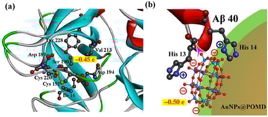 (a) Mulliken charge distributions for the Ser190 hydroxyl group in native protease, and (b) the oxygen groups of POM in the nanozyme. The purple arrow in (b) illustrates the electronegative oxygen groups of POM attacking the electropositive carbon atom in the peptide bond [59].